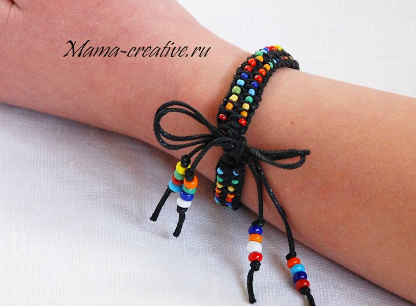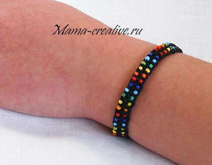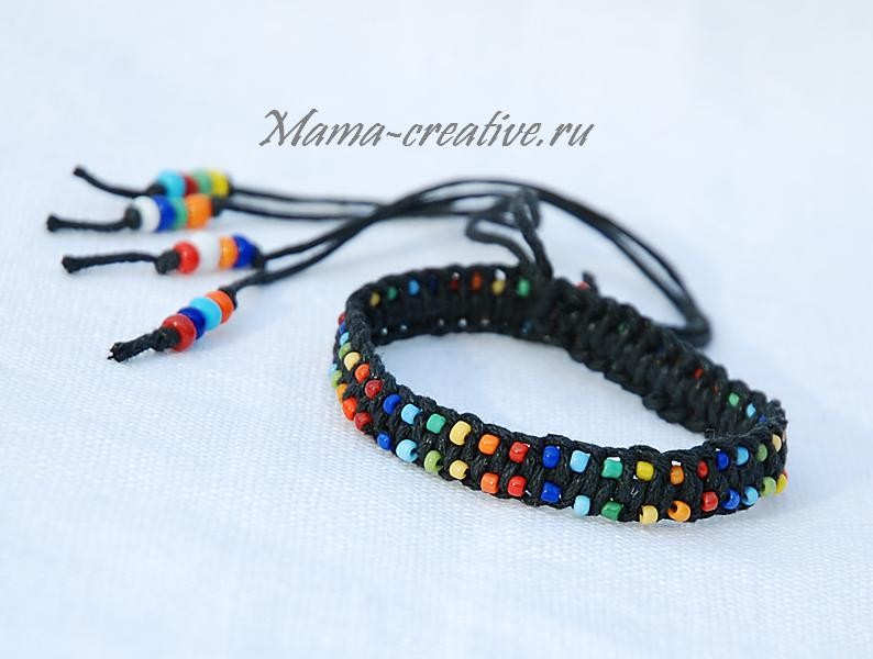 Браслет плетется в технике макраме на четырех нитях. Концы нитей обрезаются и завязываются в узелки. Сверху плетения пришивается бисер. Я выбрала разноцветный бисерный микс и составила чередование по цветам радуги.